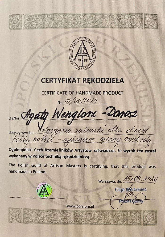 We wrześniu 2024 Ogólnopolski Cech Rzemieślników Artystów przyznał moim konikom Certyfikat Rękodzieła.