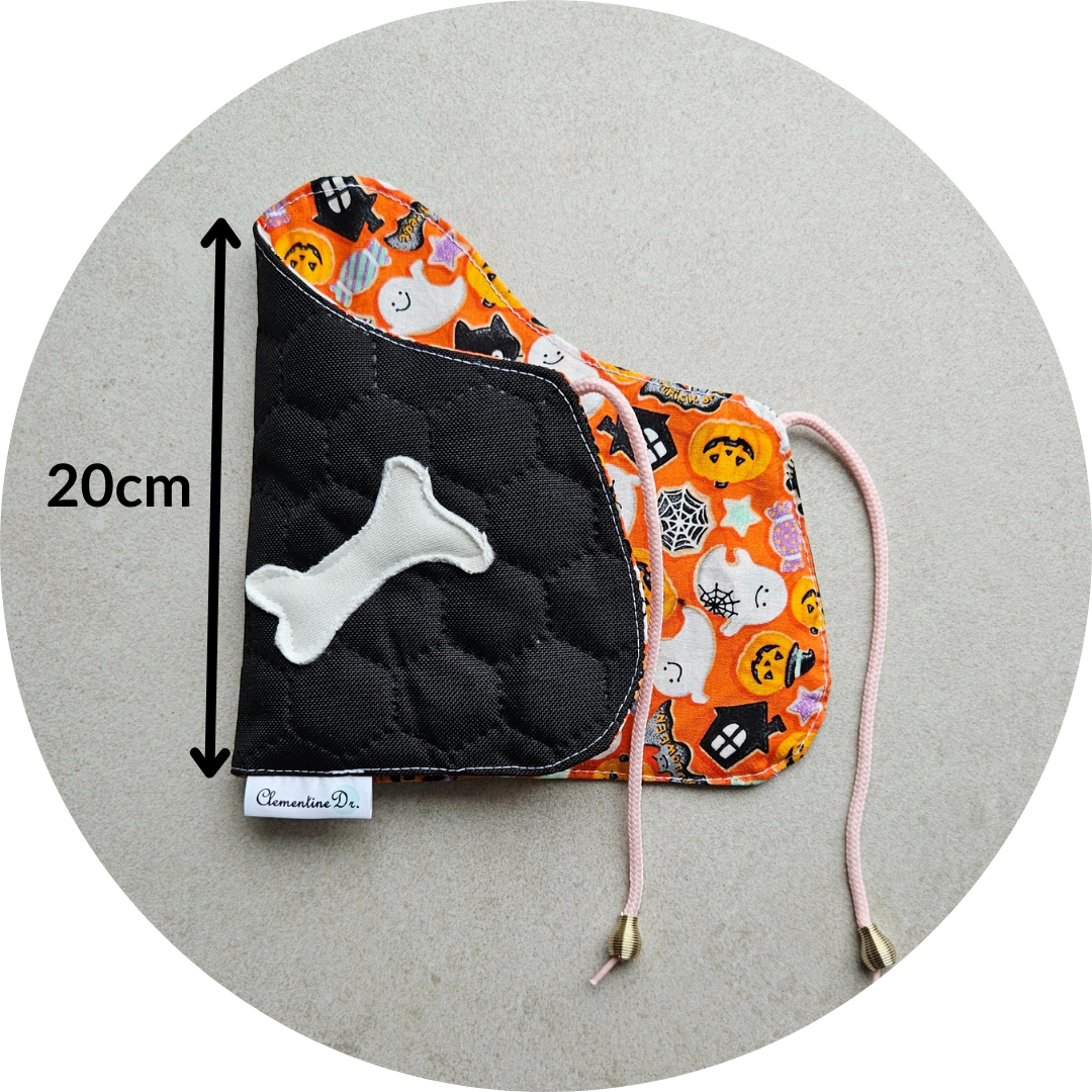 Pasuje na konika A4. Wyjątkowy Halloweenowy wzór w duchy, dynie cukierki, tło pomarańczowe. Ręcznie wykonana derka- uszyta z pikowanego materiału i cyfrowego materiału, ozdobiona naszytymi kośćmi. Pięknie trzyma kształt, ponieważ w środku znajduje się delikatne wypełnienie, które usztywnia derkę. Derka może być używana dwustronnie.