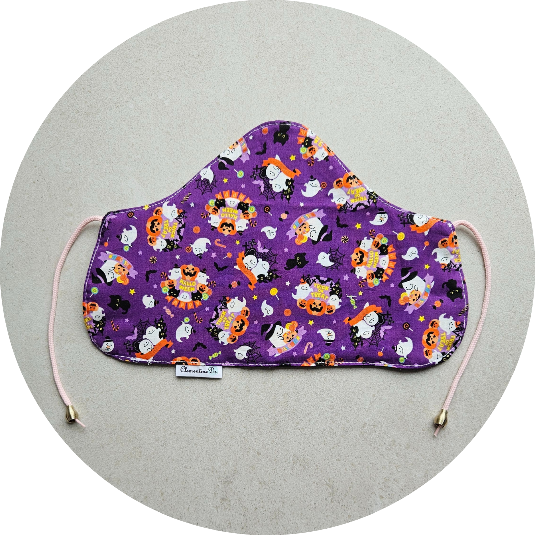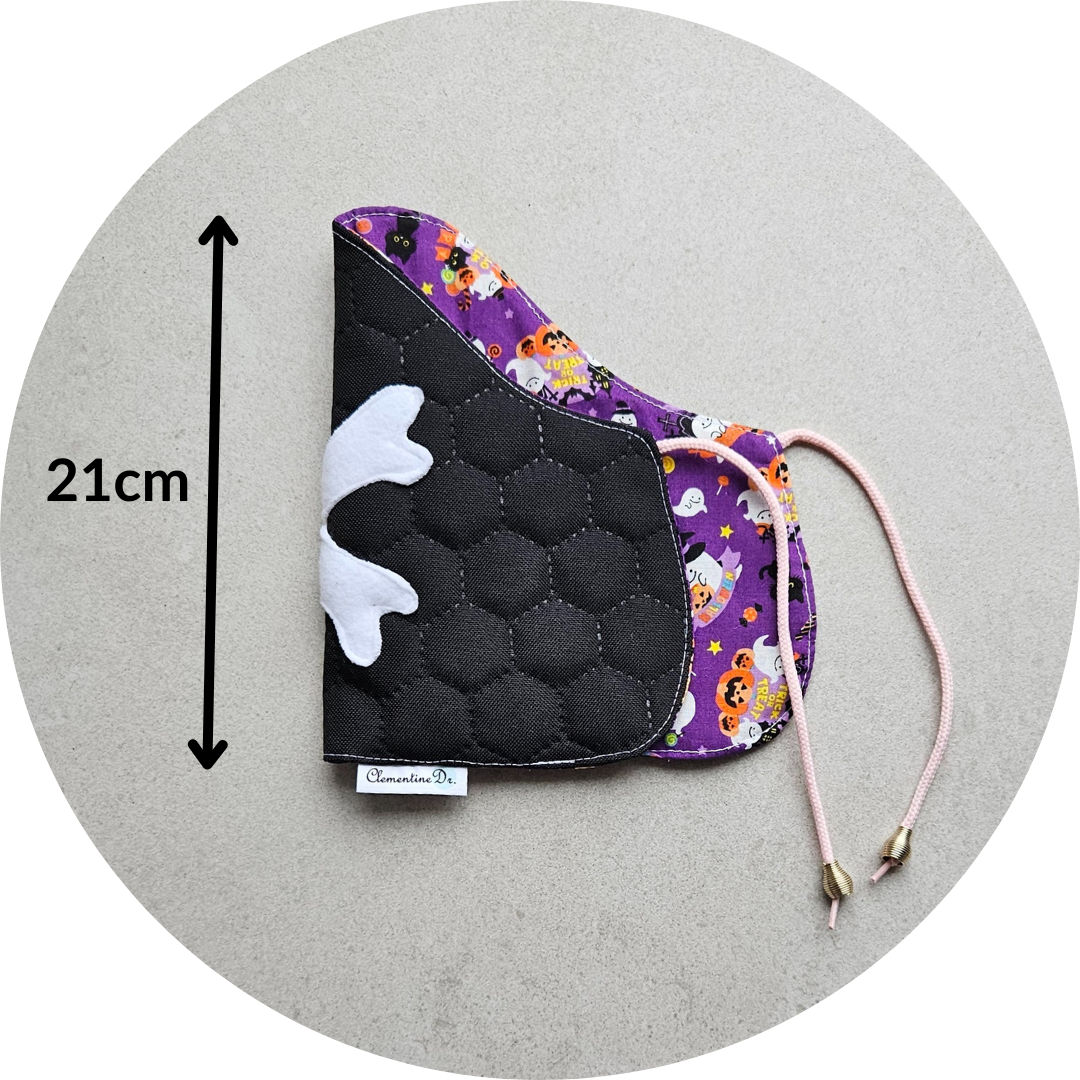 Pasuje na konika A4. Wyjątkowy Halloweenowy wzór w duchy, dynie lizaki, tło fioletowe. Ręcznie wykonana derka- uszyta z pikowanego materiału i cyfrowego materiału, ozdobiona naszytymi kośćmi. Pięknie trzyma kształt, ponieważ w środku znajduje się delikatne wypełnienie, które usztywnia derkę. Derka może być używana dwustronnie.