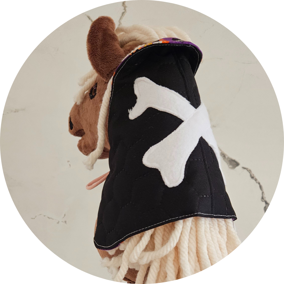 Ta derka zachwyci Ciebie i Twojego konika. Została uszyta z materiału o pięknych wzorach Halloween. Po drugiej stronie naszyte kości. Derka jest bardzo stylowa, można ją nosić dwustronnie, doda szyku i elegancji Twojemu konikowi.