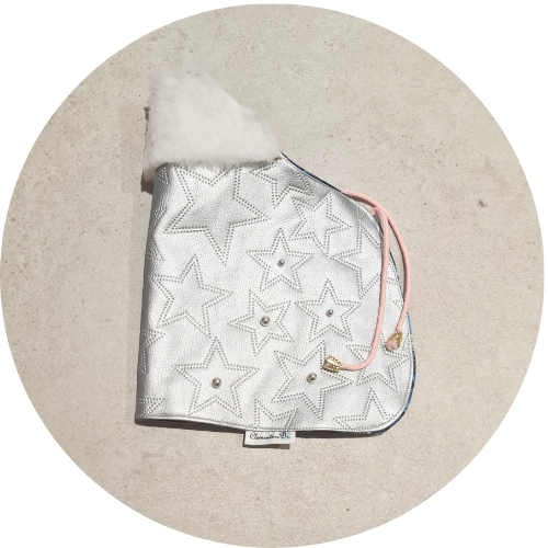 - materiał – ekoskóra w kolorze srebra, tłoczona w gwiazki