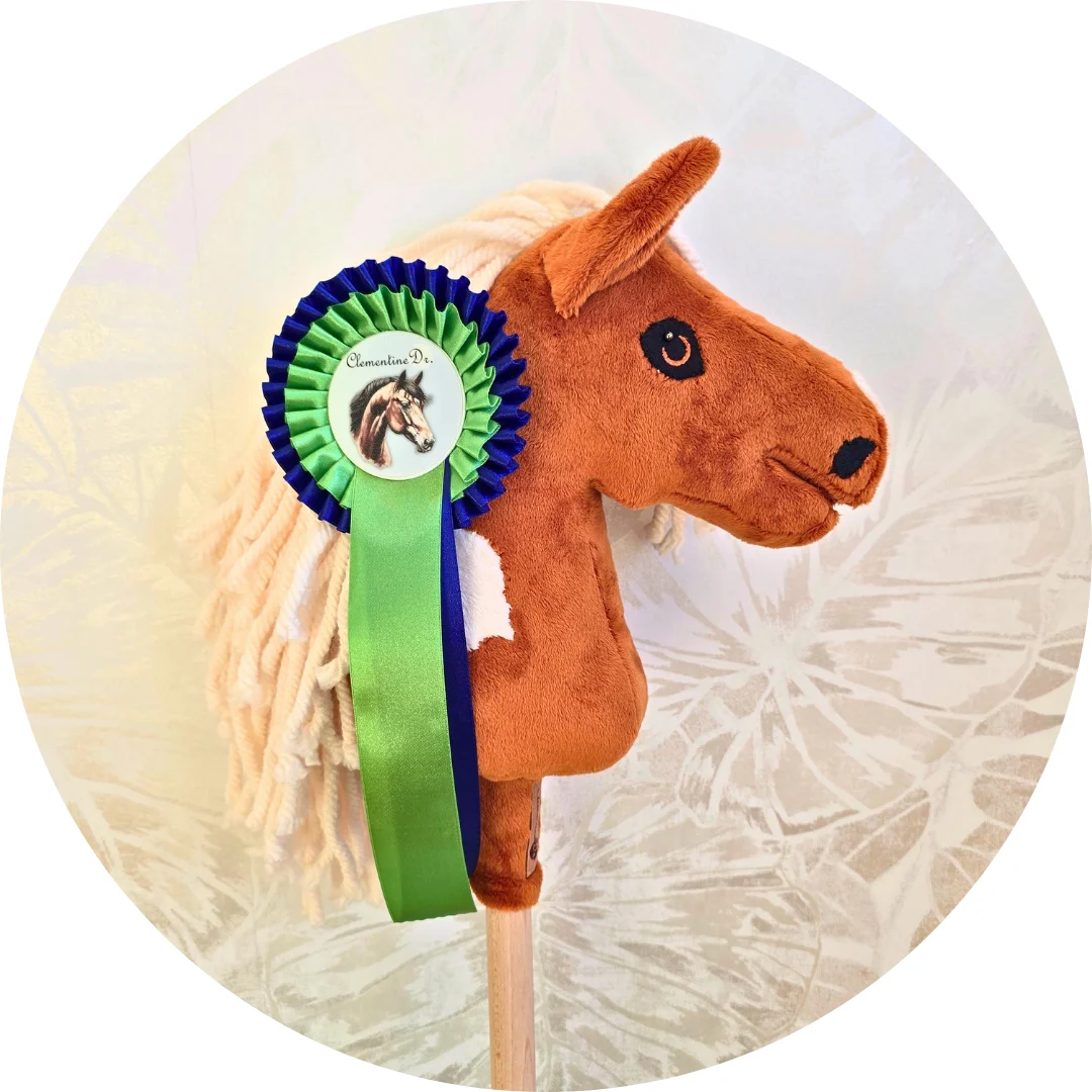 Flo dla hobby horsa to elegancka ozdoba z zielono-niebieskich wstążek, która dodaje wyjątkowego charakteru. W środku znajduje się wizerunek konika i napis Clementine Dr., podkreślającym unikalność akcesorium. Idealne na zawody i treningi, by wyróżnić swojego hobby horsa w stylowy sposób.