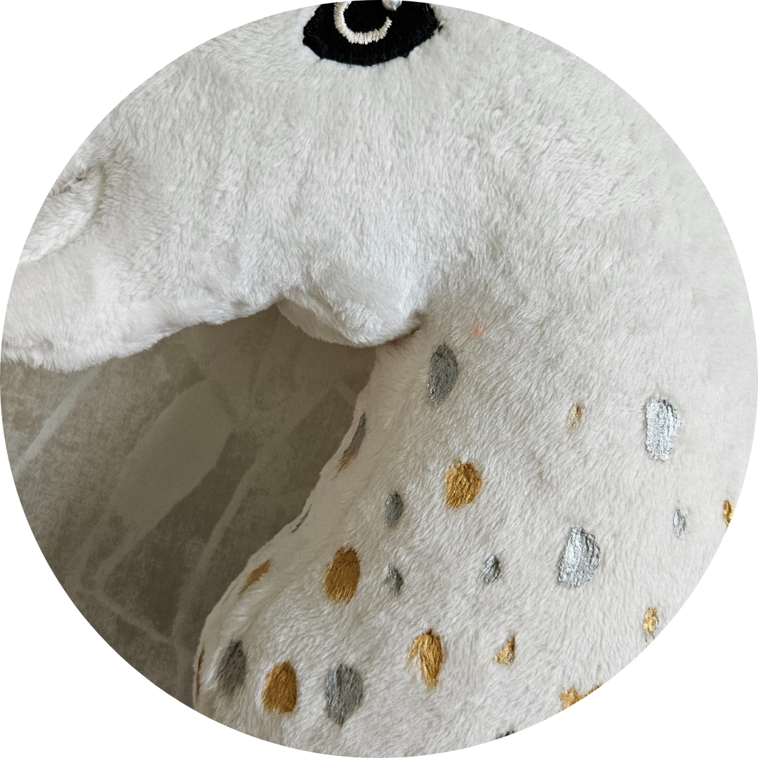 - Materiał minky w kolorze złamanej bieli, namalowane złote i srebrne łatki