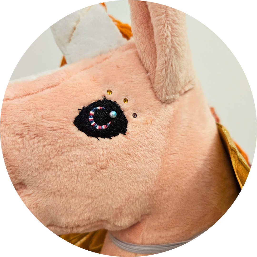 - Oczy i nozdrza wyhaftowane na hafciarce komputerowej, do oczu przymocowane na stałe perełki