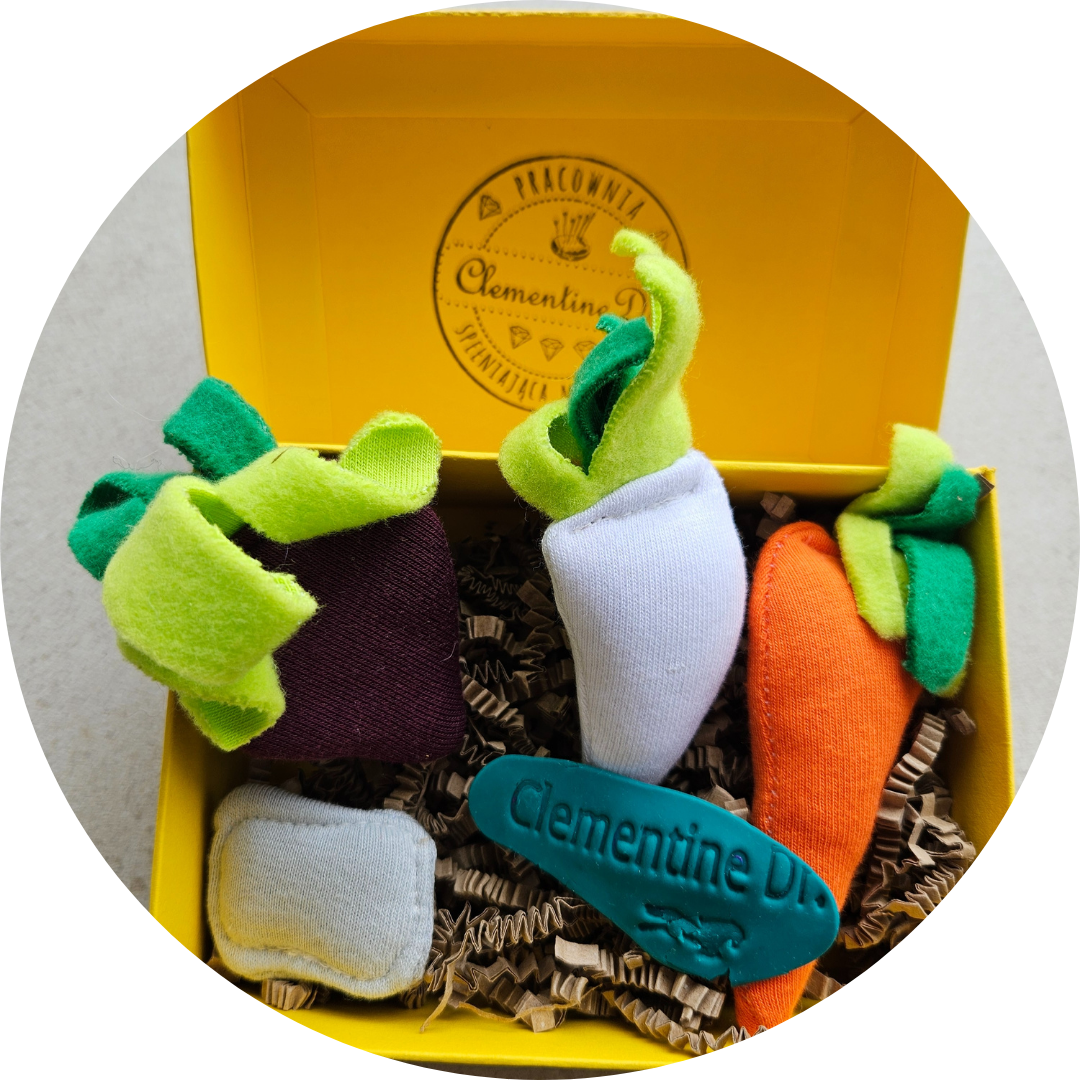 Piękne ozdoby dla Twojego hobby horsa. Komplet składa się z 5 sztuk: marchewki, buraka, pietruszki, kostki cukru i ciasteczka Clementine Dr. zapakowany w ozdobne pudełko.